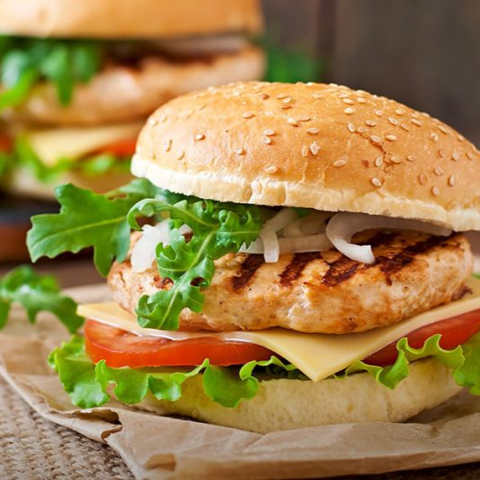 pollo, queso, jamón, repanada de tocineta, verduras y aderezos