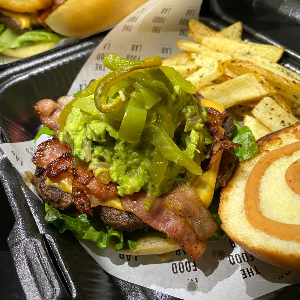Hamburguesa preparada con 100% de res, mayonesa chipotle, queso amarillo, tocino, guacamole, chilaca asada, lechuga. Incluye porción de papas.