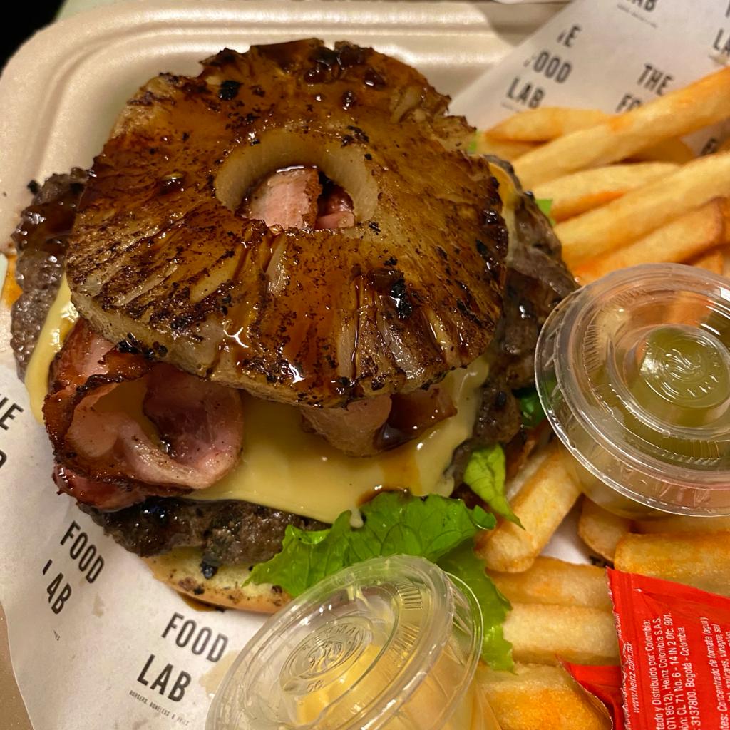 Hamburguesa preparada con 100% de res, mayonesa chipotle, queso amarillo, tocino, piña asada, lechuga y salsa Teriyaki. Incluye porcion de papas.