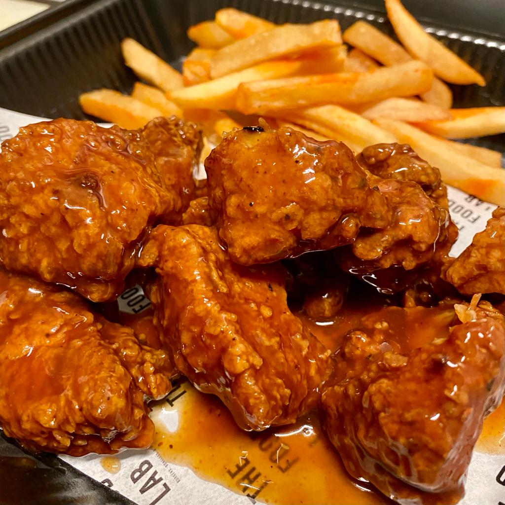 200g de Boneless en salsa a elección, 110g de papas fritas; acompañados de zanahoria y apio .