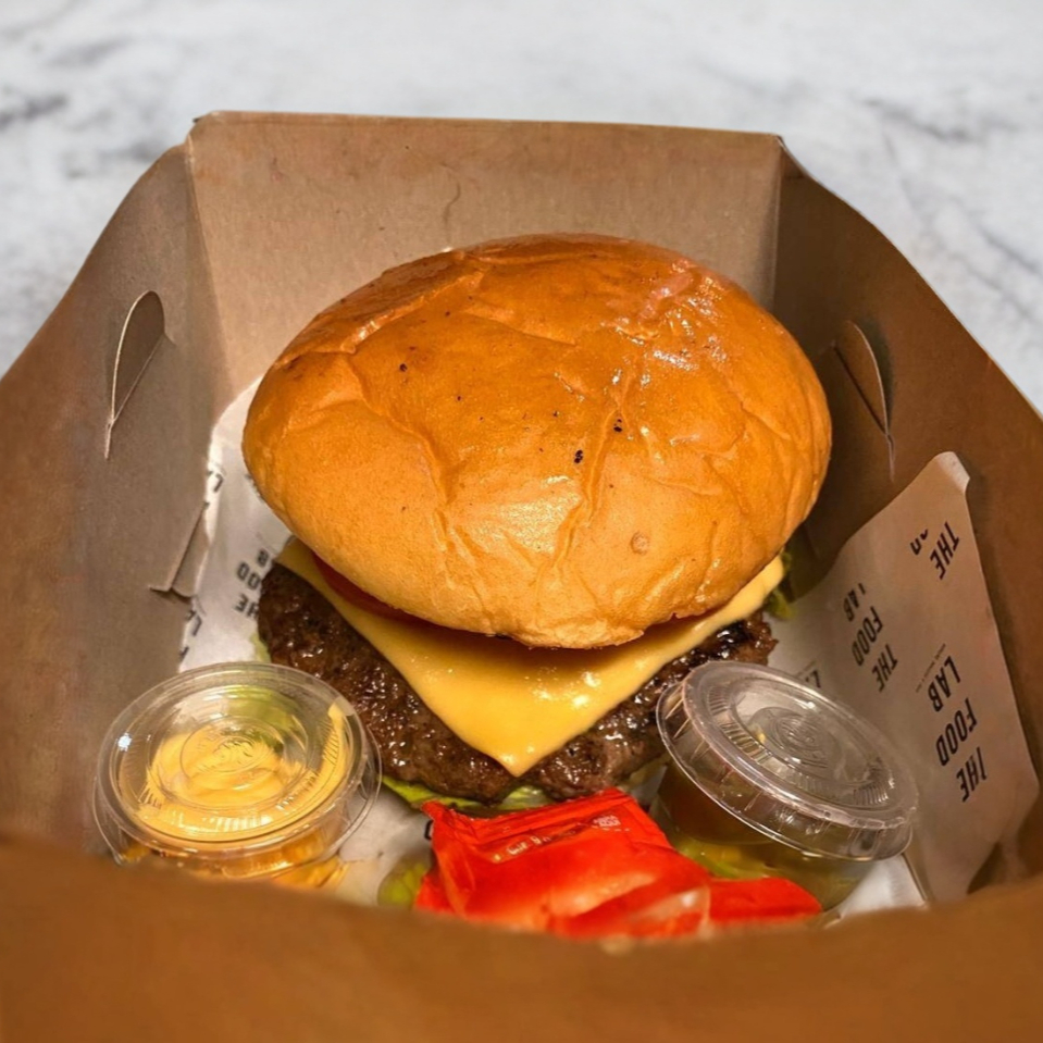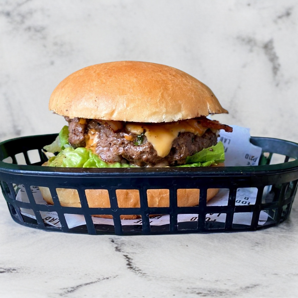 Pan brioche, 2 rebanadas de queso Americano, jugosa carne de res, cebolla caramelizada y aderezo secreto. Incluye una porcion de queso liquido (No incluye papas).