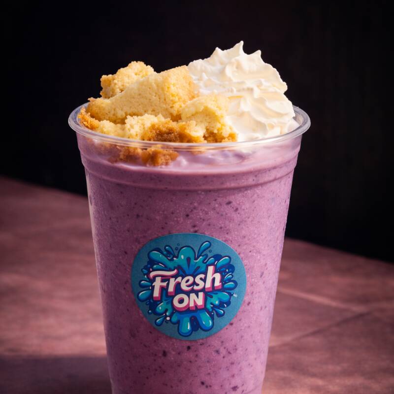 Bebida cremosa de zarzamora con trozos de cheesecake