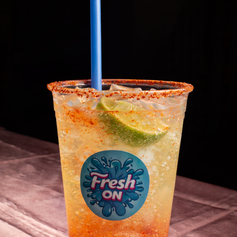 Agua mineral o refresco de toronja, limón, sal, chamoy, tajin y hielos