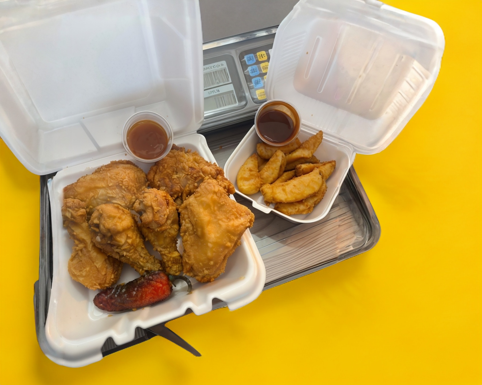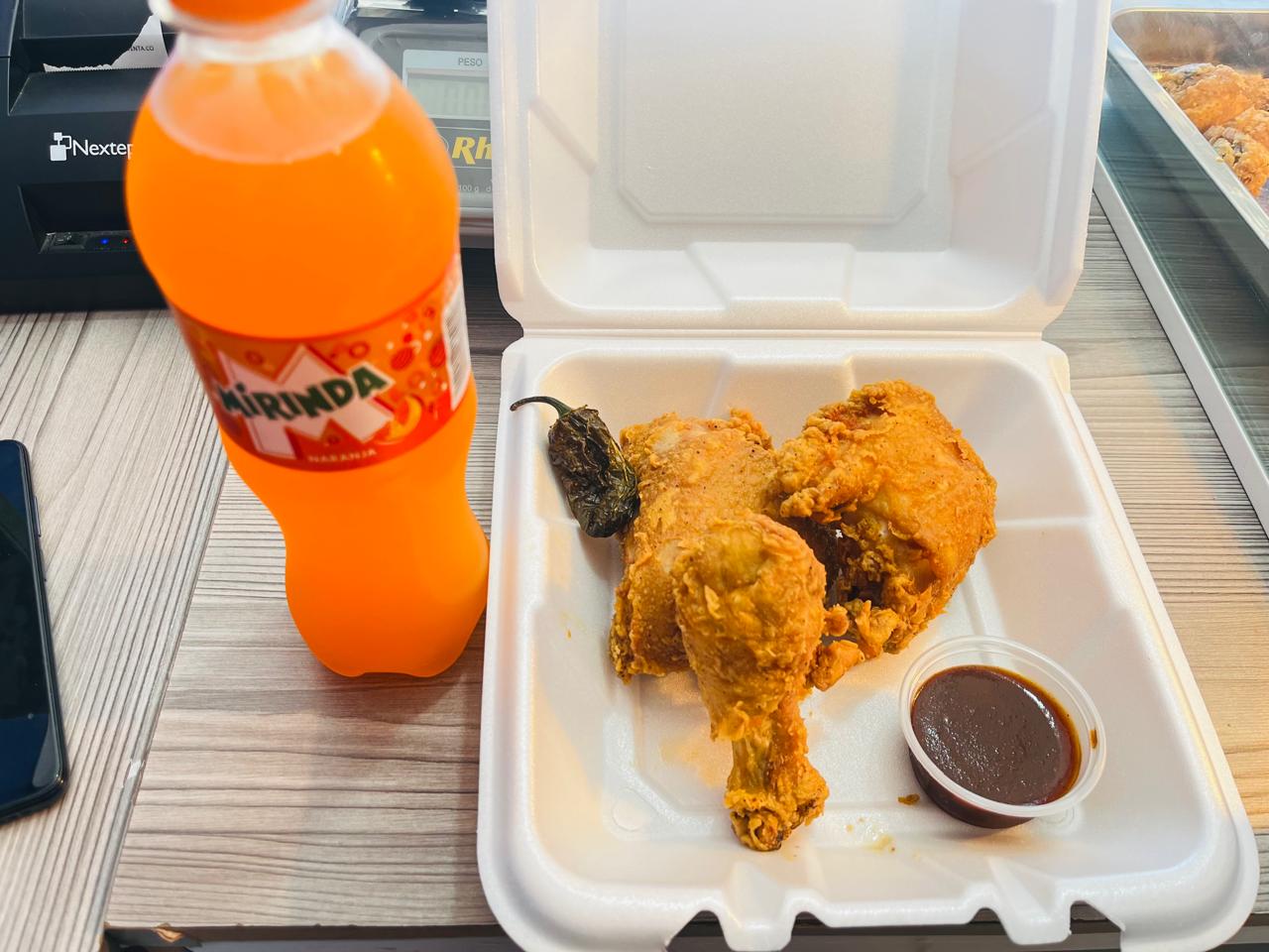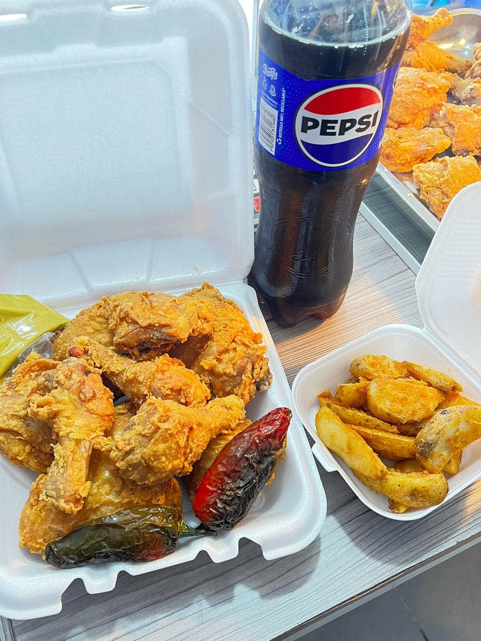 Kilo de pollo frito, 1 orden de papas, 1 Pepsi de 1.5 L y 2 aderezos.