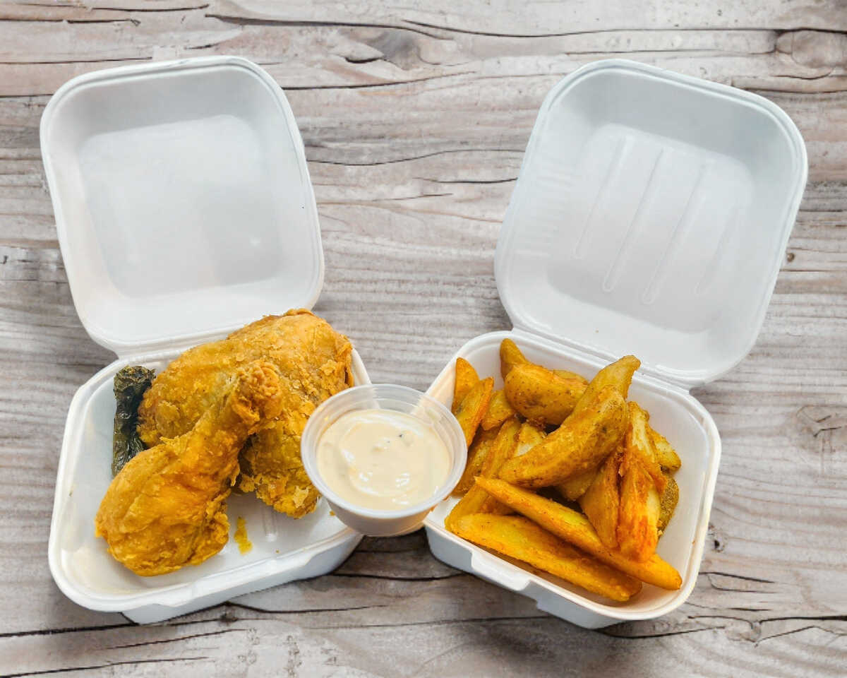 2 Piezas de pollo, 1 orden de papas y 1 aderezos.