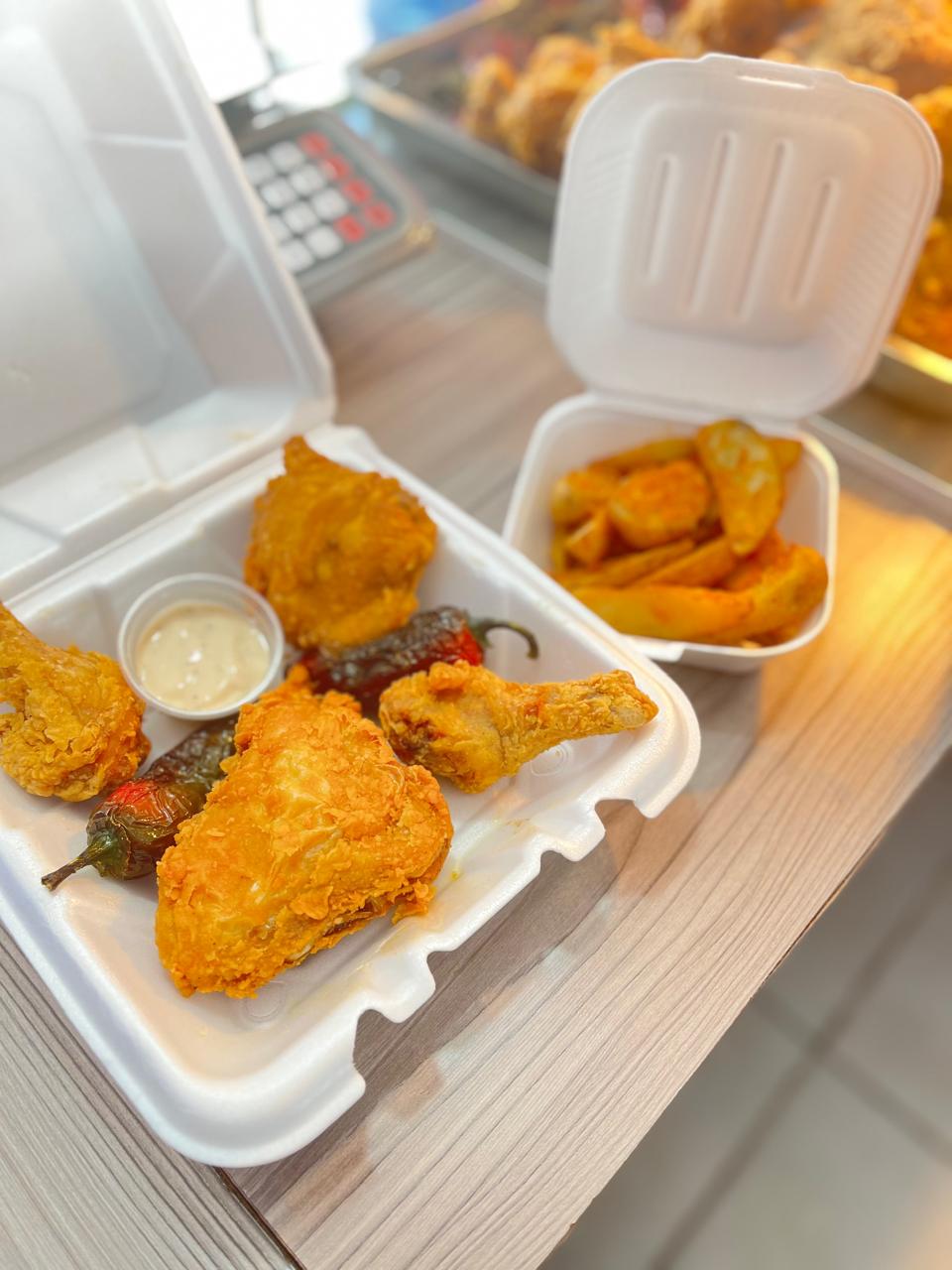 6 Piezas de pollo, 1 orden de papas y 2 aderezos.
