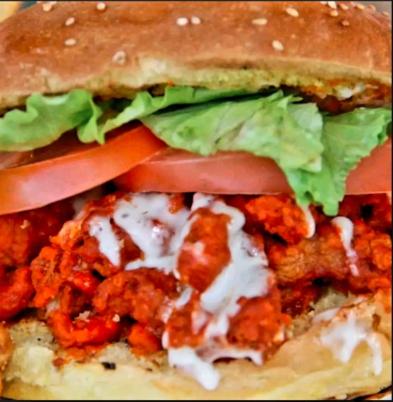 Hamburguesa rellena de boneless con carne casera, jamón, queso, tomate, cebolla, lechuga, chile, mostaza, mayonesa y cátsup Del Monte.