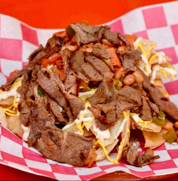 1/2 Orden de totopos con carne asada, salchicha asada, queso amarillo, mayonesa, frijoles charros y queso blanco.