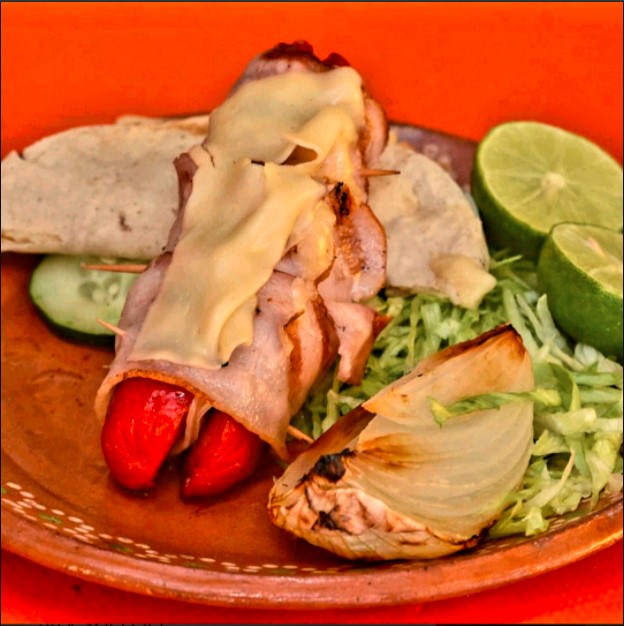 Salchicha asada envuelta en tocino con queso blanco derretido acompañada de su ensalada, tortillas y salsa