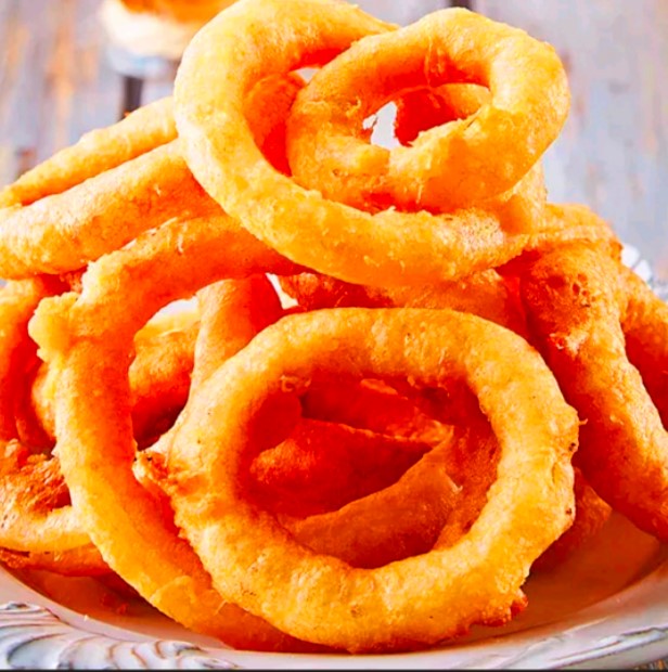 Media libra de aros de cebolla acompañadas de queso amarillo catsup y mayonesa.