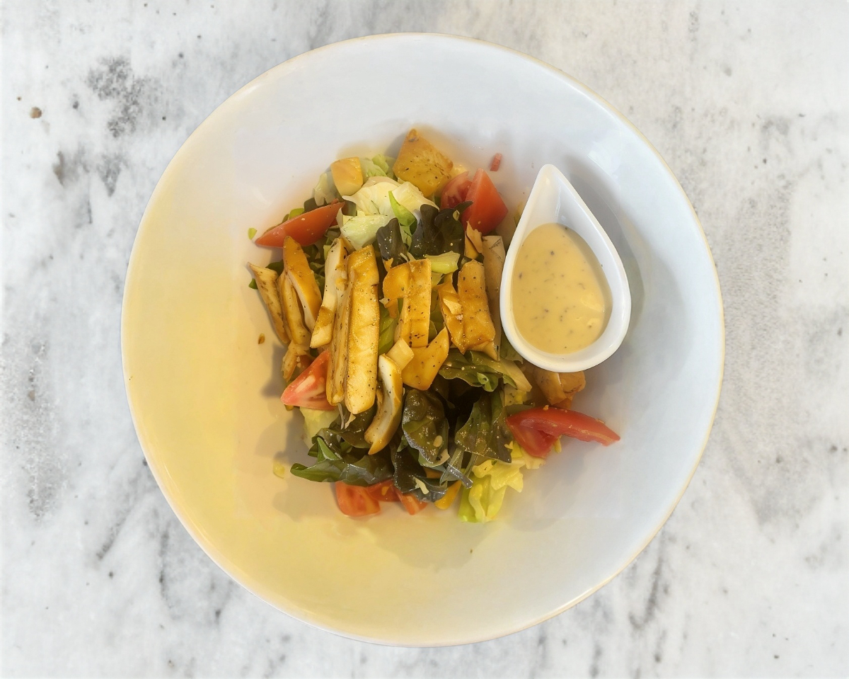 Pechuga de pollo marinada sobre una mezcla de lechuga, frontones y queso parmesano acompañado de aderezo cesar.