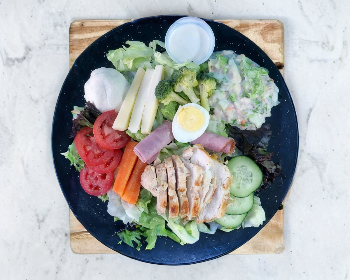 Pechuga de pollo marinada, brócoli, zanahoria, apio, pepino y jícama, puré de papa porcion de ensalada de atún, medio huevo duro, queso, jamón de pavo todo sobre una cama de frescas lechugas.