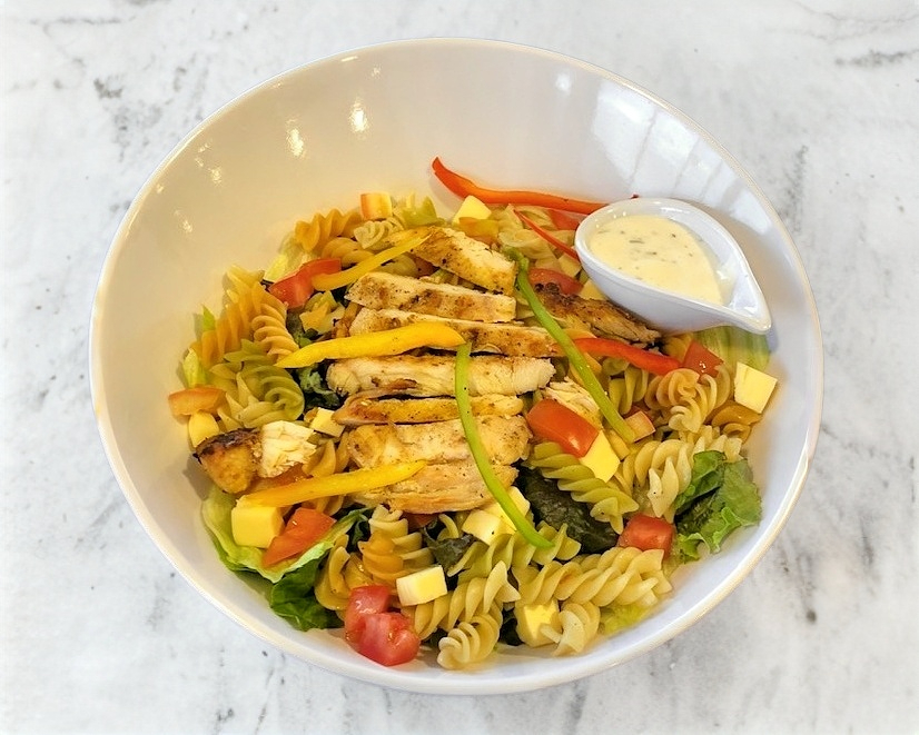 120gr de pechuga de pollo, pasta, trocitos de queso manchego y tomate sobre una cama de lechugas con aderezo italiano