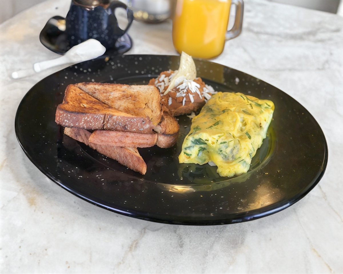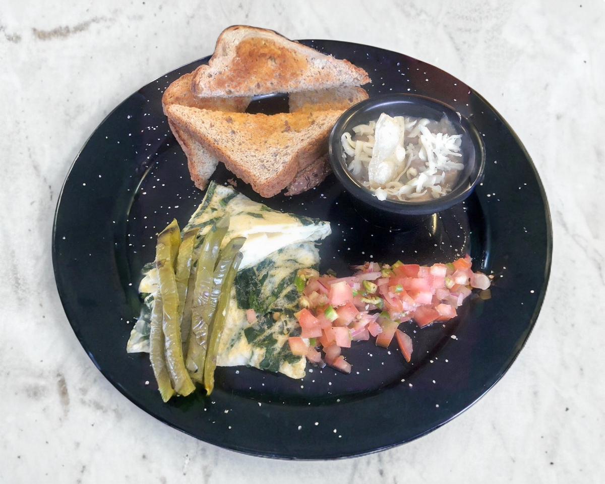 3 claras de huevo con espinacas, nopalitos asados y queso panela acompañado de pan tostado con mantequilla y pico de gallo.