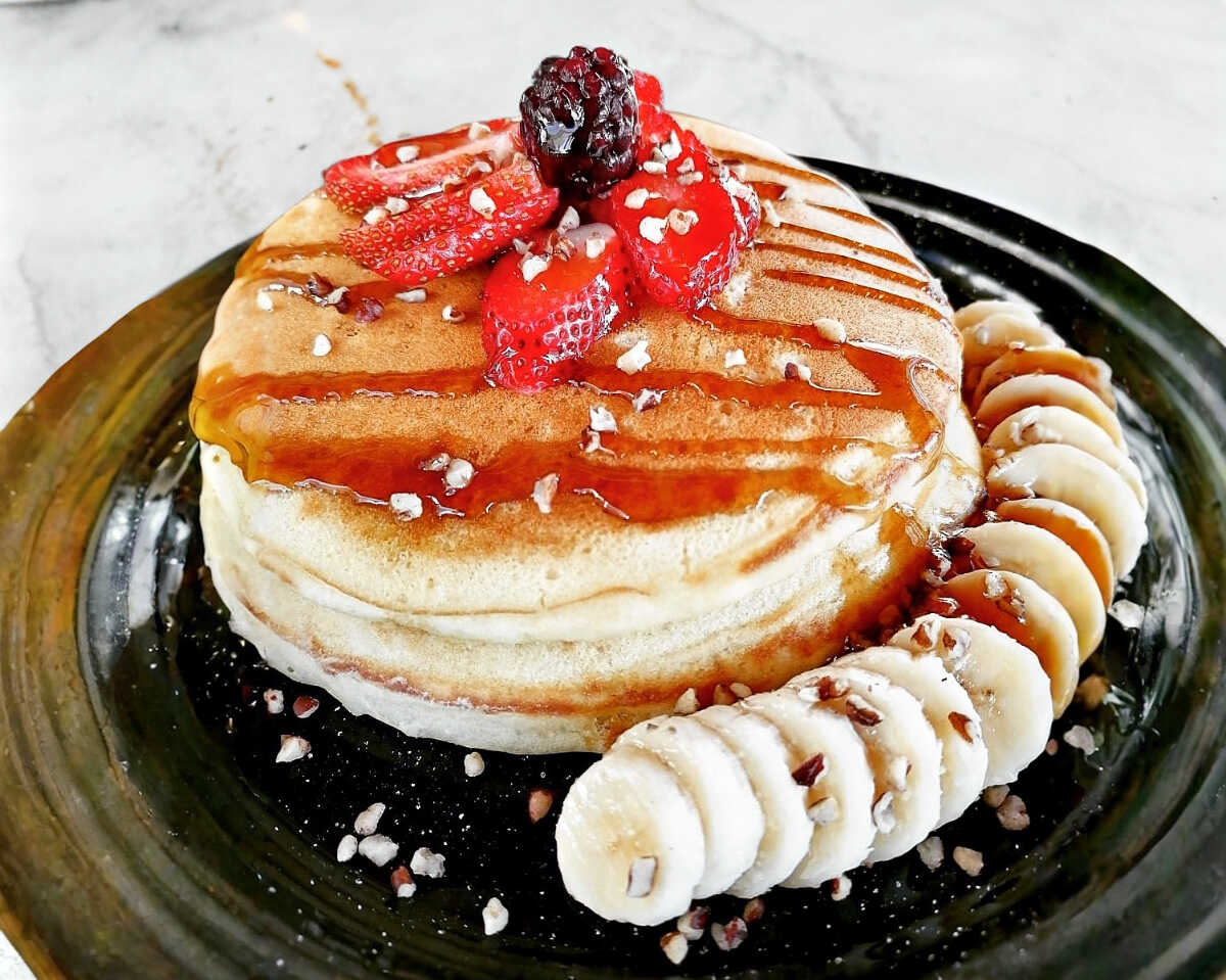 2 piezas de hotcakes integral con topping de plátano y fresas
