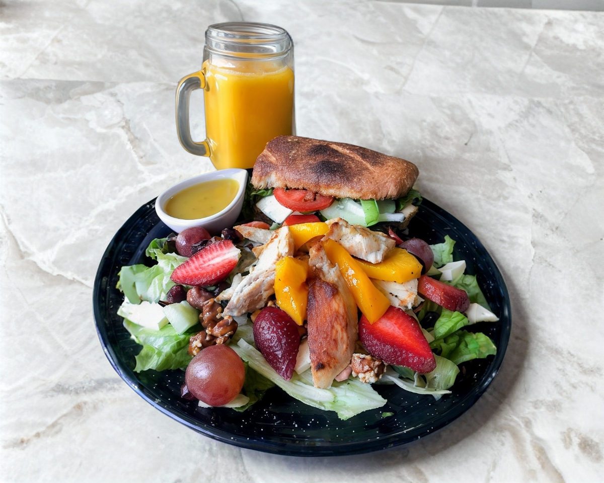Exquisitas fresas, mango y uvas, cacahuate dulce, arándano, queso panela pepino sobre tiras de pollo y lechuga acompañado de aderezo mostaza miel.