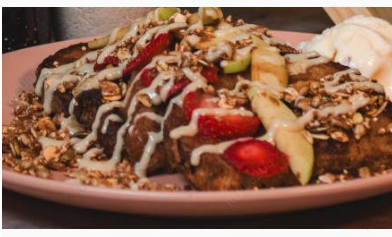 Receta clásica con pan de grano con masa madre, bañado en salsa de canela con maple, servido con plátano y nieve.