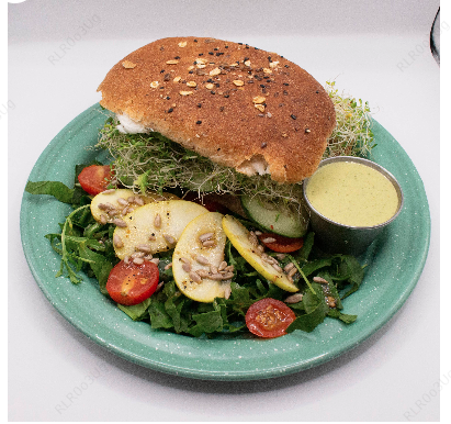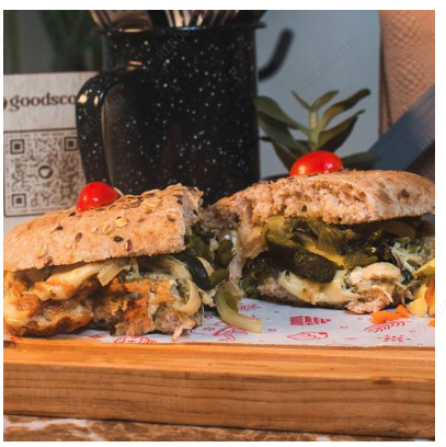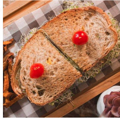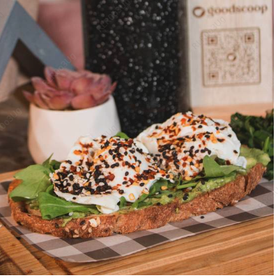 Guacamole, dos huevos pochados o revueltos, tomate cherry, germinado y mix de ajonjolí con chiliflakes, espolvoreado con queso de cabra, servido en pan de masa madre y un toque de aceite de oliva.