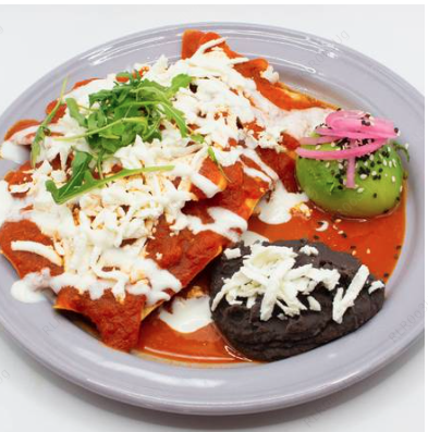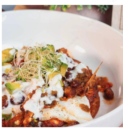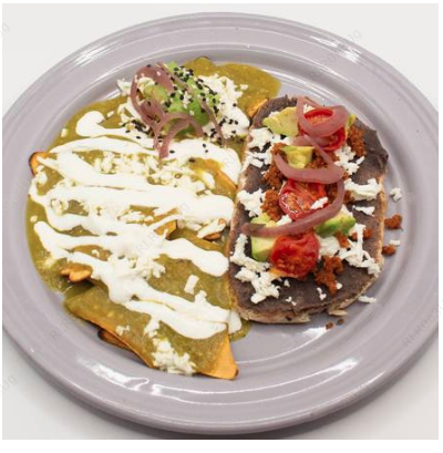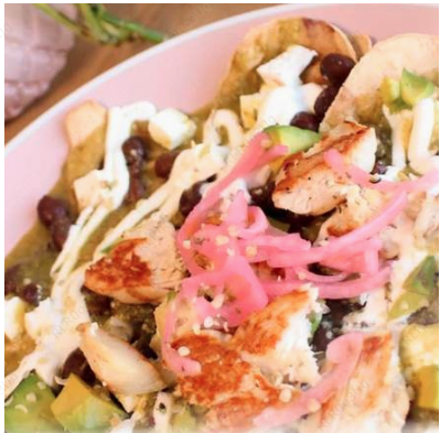 Totopos horneados bañados en salsa a elegir, frijoles negros, queso panela, cebolla morada, crema o yogurt orgánico y aguacate.