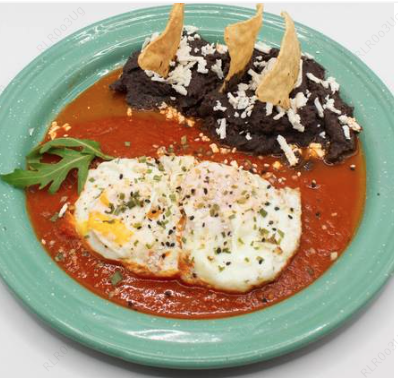 Huevos al gusto servidos sobre una cama de frijoles con un toque de cebolla morada, panela asada y aguacate, ahogados en nuestras deliciosas salsas.