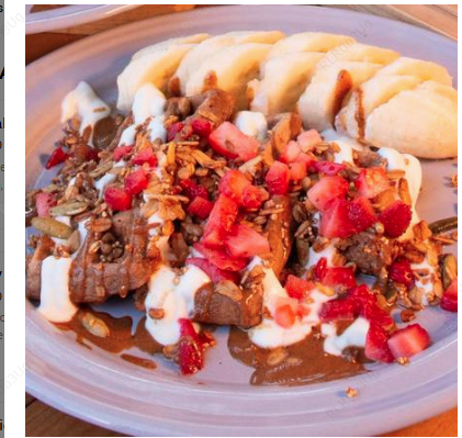 Plátano, matcha, crema de almendra, miel y leche de coco, mango.