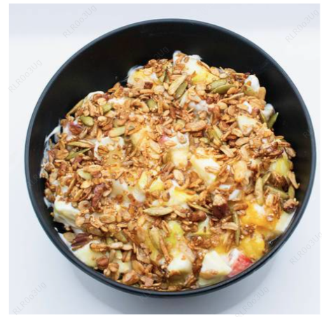 Yogurt griego, plátano, berries, manzana verde, granola casera y miel de abeja.