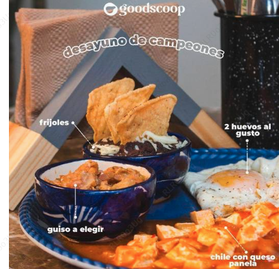 Chile con queso panela, dos huevos al gusto, frijoles y un guiso a elegir.