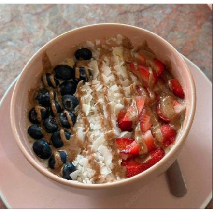 Fresas, acai orgánico, moras, leche de almendra sugar free, yogurt griego y monkfruit con topping de granola keto, spread de maca canela, blueberries y fresa.