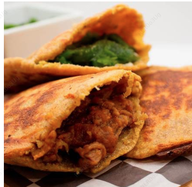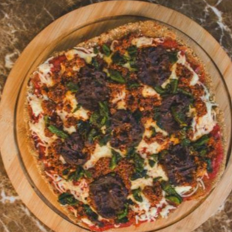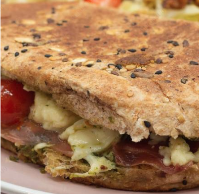 Pollo, queso panela, cebolla morada, tomate, espinaca y pesto de la casa.