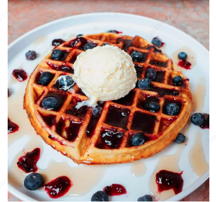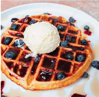 Clásico y esponjoso waffle bañado en mermelada de blueberry, blueberries y bola de nieve de vainilla.
