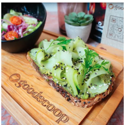Pan de masa madre, pesto a base de menta, aguacate, edamames y aceite de oliva, pepino y hemp.