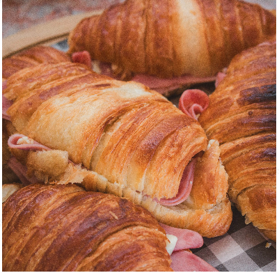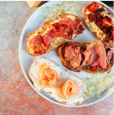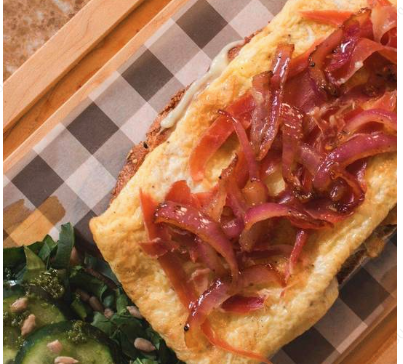 Pan de masa madre, jamón serrano, huevo revuelto, queso de cabra cremoso, cebolla caramelizada y cebollín.