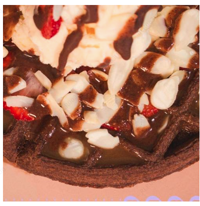 Waffle hecho a base de harina de avena y almendra, libres de lácteos y azúcares refinados, con crema de avellana, cacao y plátano.