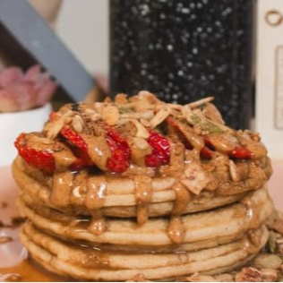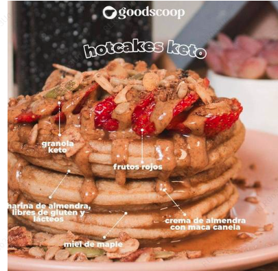 Elaborados con harina de almendra, libres de gluten y lácteos, con un toque de monkfruit, servidos con frutos rojos, granola keto, miel de maple sugar free y topping de crema de almendra con maca y canela.