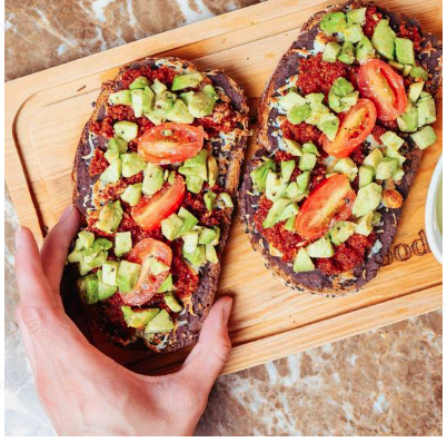 Dos piezas de pan de masa madre, frijoles negros gratinados, chorizo de quinoa hecho en casa, con un toque de aceite de oliva, aguacate y tomate.
