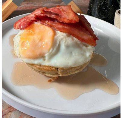 Nuestros deliciosos hot cakes keto servidos con huevo estrellado, tocino y miel de maple sin azúcar.