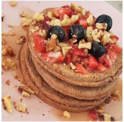 Hot cakes hechos a base de harina de avena y almendra, con plátano, manzana, crema de cacahuate y granola.