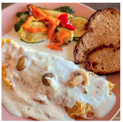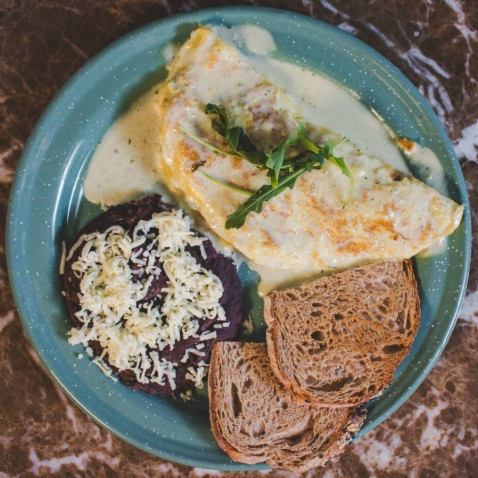 Omelette bañado en salsa cremosa suiza, relleno de pollo y queso, acompañado de frijoles negros y pan de masa madre.