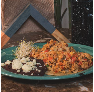 Huevo revuelto con carne seca y pico de gallo, acompañado de frijoles, salsa de molcajete y quesadilla de panela.