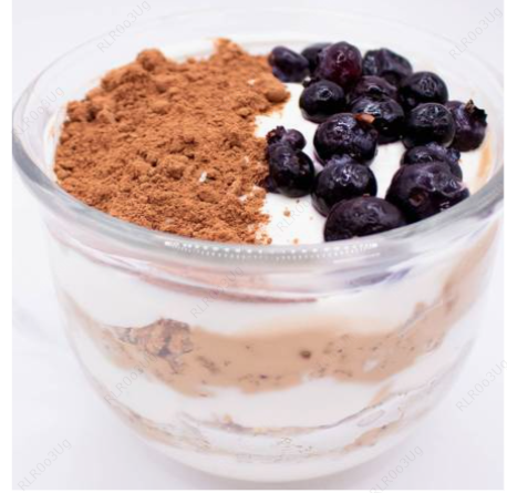 Yogurt griego, sin endulzar, chía, leche de almendra, berries, dátil, coco y crema de almendra.