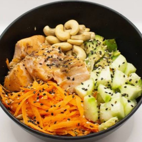 Base de pasta o quinoa y espinacas, aguacate, brocoli, tomate cherry, agucate, garbanzos crujientes y salmón.