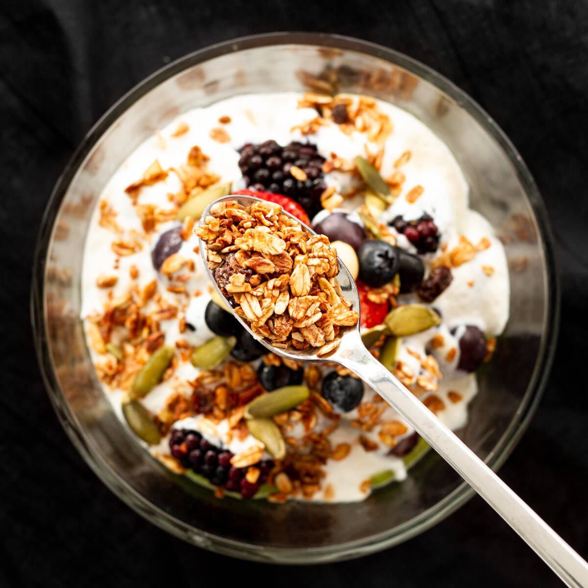 Yogurt griego, crema de café, panqué de plátano con avena, berries.