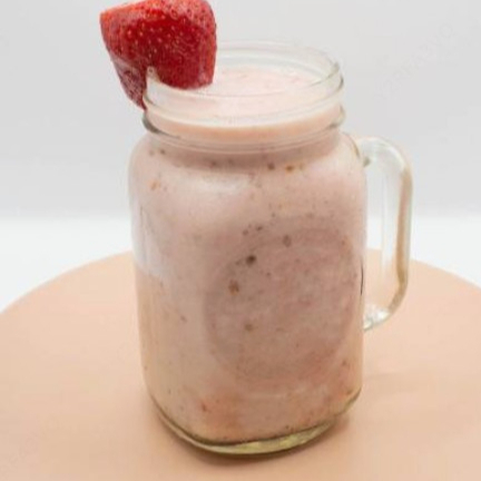 Leche de almendra, fresas, proteína habits, colágeno, yogurt griego sin azúcar, miel de agave orgánica y coco rallado.