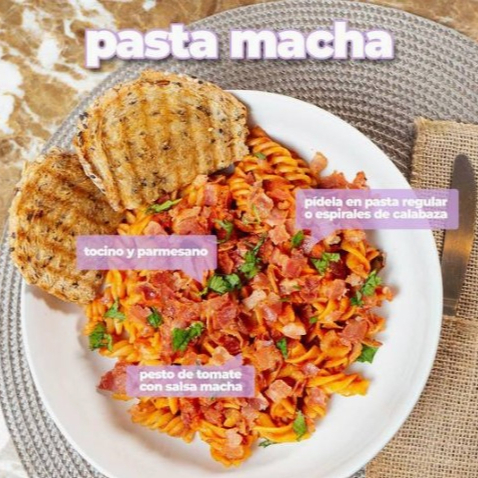 Pesto de albahaca, aceite de oliva, pistache, tomate cherry, pollo (130grs) y hogaza tostada con ajo. Elige tu base.