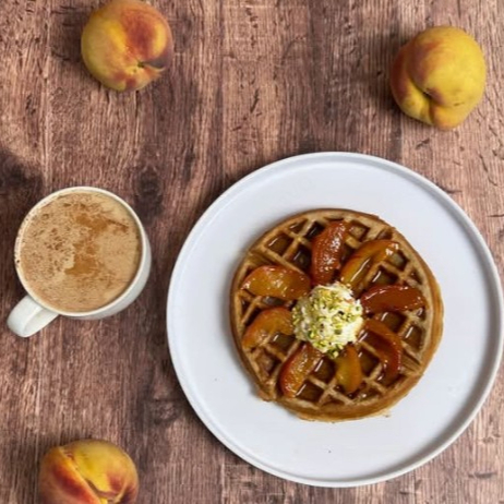 WAFFLE CLASICO Y ESPNJOSO CON MERMELADA DE DURAZNO DE LA CASA, QUESO DE CABRA Y UN TOQUE DE PISTACHE