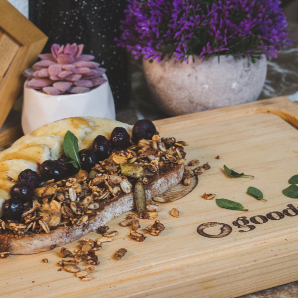 Pan de masa madre, queso de cabra artesanal de granja amantolli, mermelada de blueberry sugar free, plátano, blueberries y pistache.