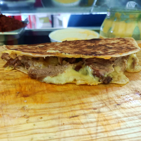 Tortilla de Harina casera, Carnitas, Aguacate, Cebolla caramelizada, jalapeños y Queso