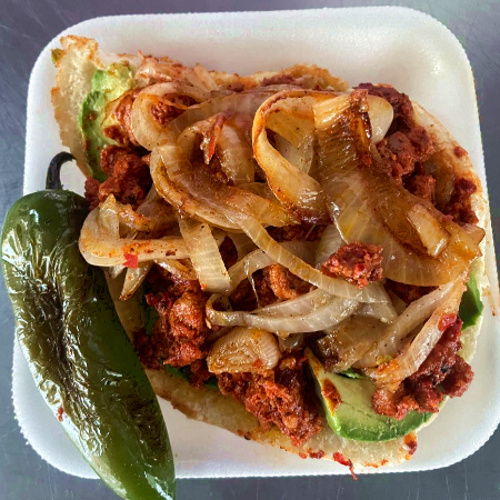 Tortilla de Harina casera, Adobada, Aguacate, Cebolla caramelizada, jalapeños y Queso