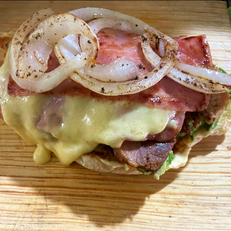 Complemento a elegir, Aguacate, Jamón con queso fundido , Cebolla caramelizada, Jalapeño y Aderezos