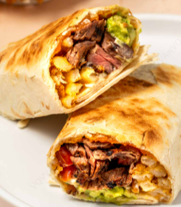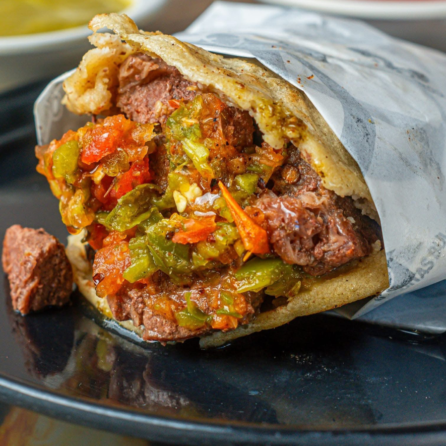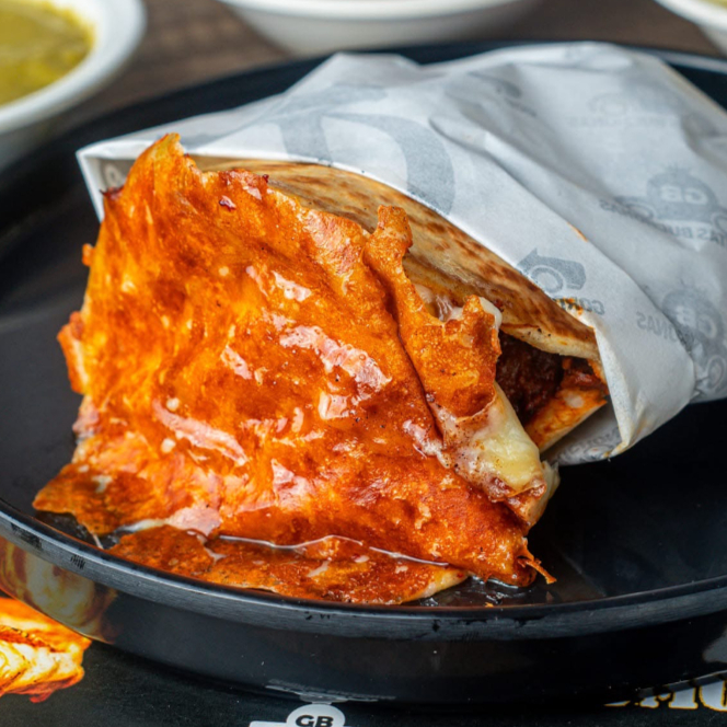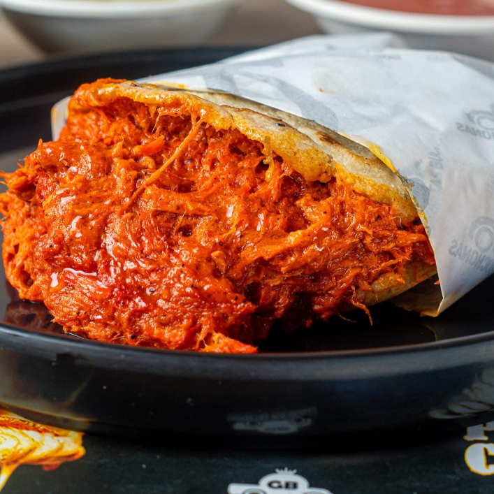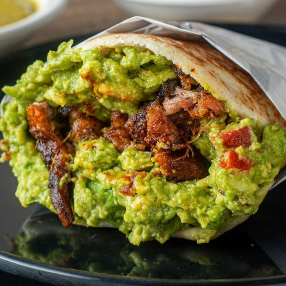 Gorda grande especial rellena de pechuga de pollo con frijolitos y salsa de aguacate.